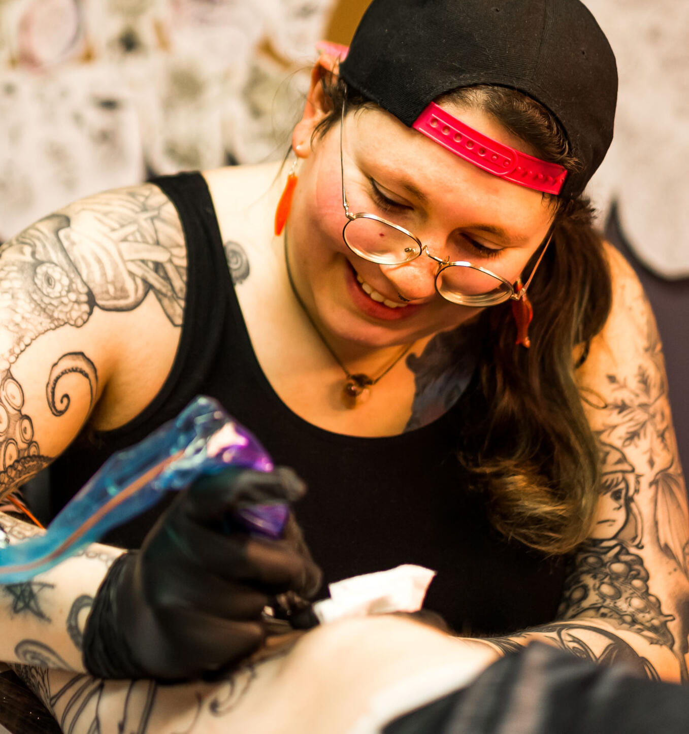 Holly has been tattooing since 2020 and making art since childhood. She draws inspiration from the fantastical creatures and characters of film, anime, and video games, as well as art history. She enjoys designing custom tattoos that mix queerness with the spooky, the cute, the badass, and the sexy.Originally from the Seattle area, Holly has a deep admiration for nature. She enjoys the ocean and the woods, and grew up on a rural island in the Puget Sound. She moved to Portland to pursue an art degree, but didn't take to academics. She spreads humor and good cheer during her appointments and adores a good pun.Holly's favorite video game is Bloodborne, her favorite genre is horror, and her favorite movie is Kiki's Delivery Service. She lives in the Portland area with her wonderful wife and their goblin-esque cats.
